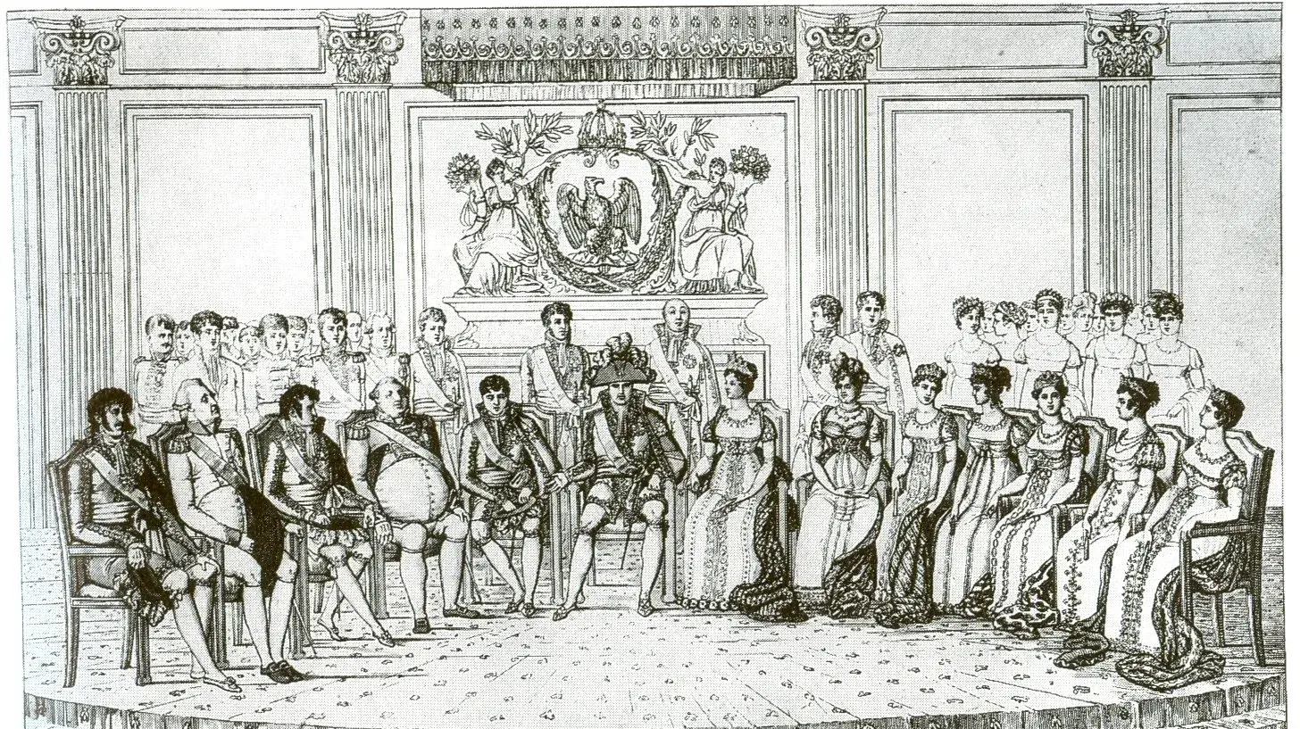 Napoleon mit Mitgliedern des Rheinbundes: König Friedrich ist der 4. von links und Familienmitgliedern auf der rechten Seite.